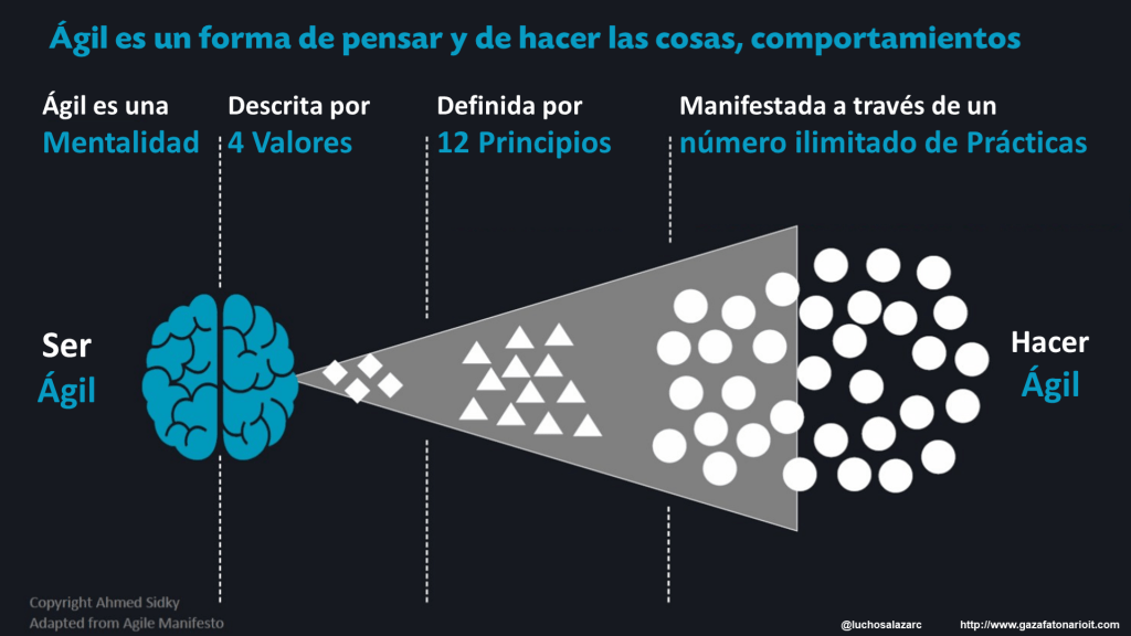 El pensamiento y el comportamiento ágil se funda en lo que conocemos como el Manifiesto Ágil, que enuncia cuatro valores, que conducen nuestro comportamiento de agilistas, intrínsecos a nuestra forma de pensar y de interpretar el mundo que nos rodea, de alguna manera subjetivos, emocionales y hasta debatibles. Pero valores al fin y al cabo. Los valores ágiles son importantes para nosotros y los practicamos incluso de manera inconsciente, sin ningún esfuerzo. Estos valores se complementan con doce principios, extrínsecos o manifiestos que nos ayudan a hacer objetivos los valores, a hacerlos más concretos, incluso impersonales y a poner esos valores en evidencia. Los principios ágiles son indiscutibles. Los valores ágiles se basan en los principios.