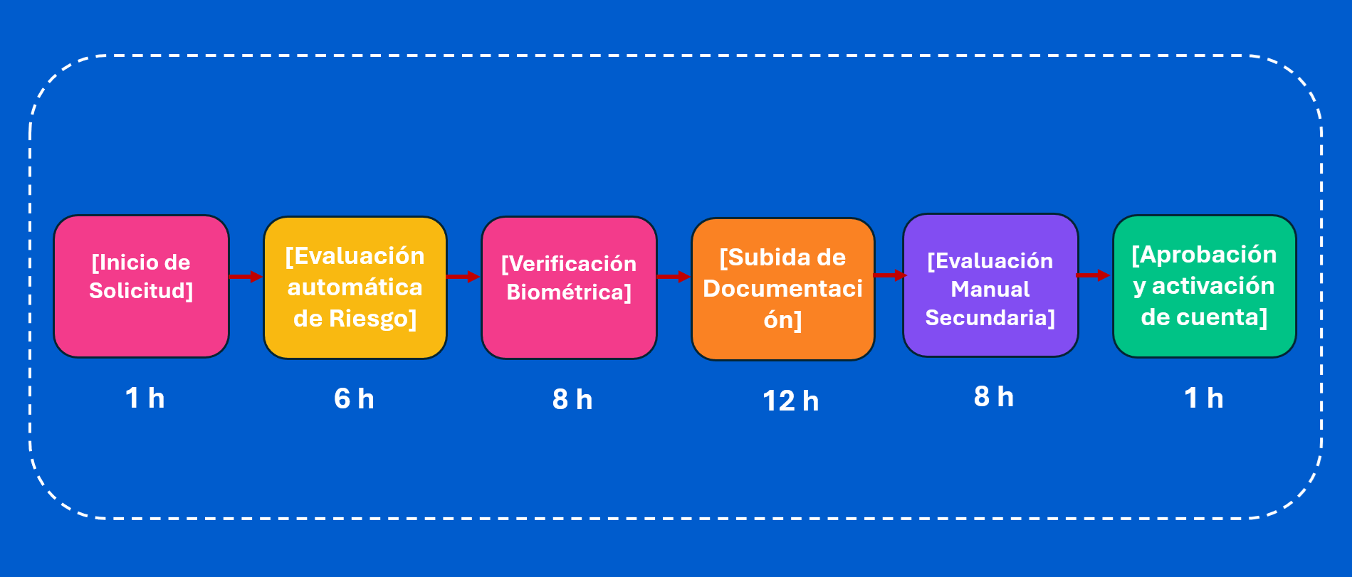 [Inicio de solicitud] –1h–> [Evaluación automática de riesgo] –6h–> [Verificación biométrica] –8h–> [Subida de documentación] –12h–> [Evaluación manual secundaria] –8h–> [Aprobación y activación de cuenta]
