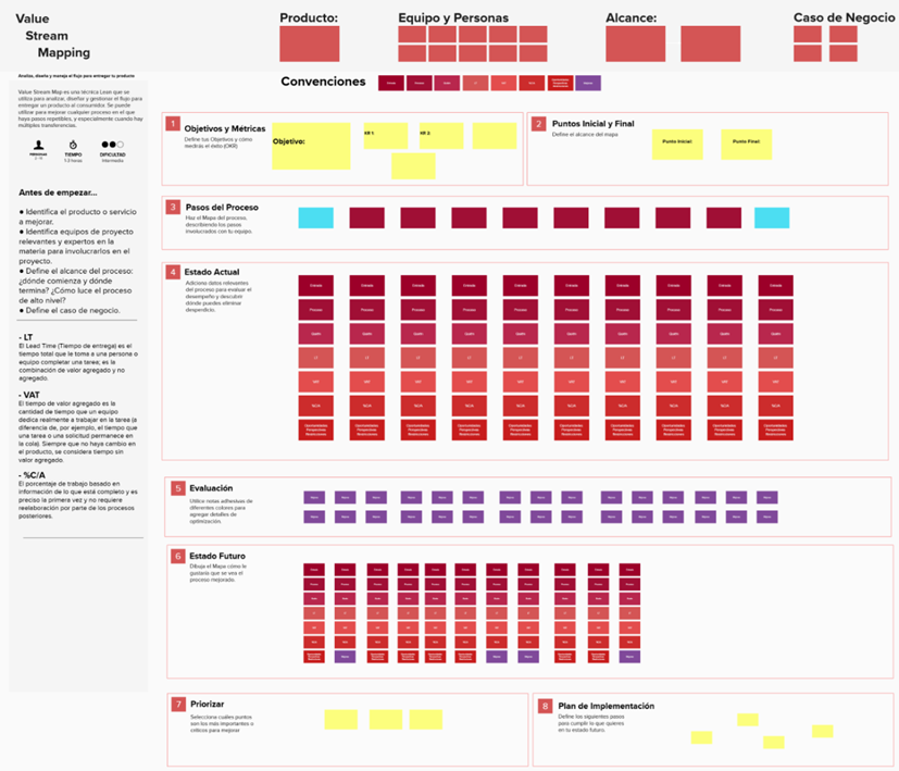 En este punto, te dejo con una plantilla en Mural (adaptada de otra que encontré) para que comiences a visualizar tus mapas de flujo de valor de inmediato.