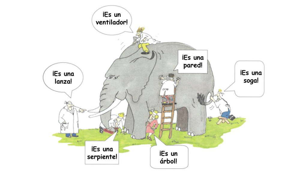 Surgen diferentes perspectivas porque cada uno tiene su propio «enfoque» moldeado por experiencias, conocimientos y prejuicios personales. Esta es la clásica historia de los ciegos que describen un elefante: uno siente la trompa y dice que es una serpiente, otro agarra la pata y afirma que es un árbol, mientras que el que toca la cola piensa que es una cuerda. Todos tienen razón, pero no están alineados.