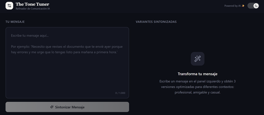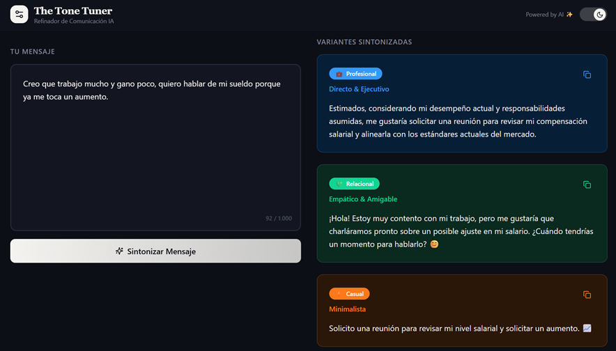 Hoy por hoy, escribir un mensaje en WhatsApp o un correo electrónico se ha convertido en algo común, pero nunca estás seguro de si suenas demasiado agresivo, muy tímido o poco profesional. La solución: una caja de texto donde escribes o pegas tu mensaje y la IA te ofrece 3 versiones instantáneas: una «Directa y Ejecutiva», otra «Empática y Amigable» y una más «Mínima (estilo Gen-Z)». ¿Te gusta la idea? A mí sí. Es un “Sintonizador de Tono Comunicacional”. Les dije que este asunto de la comunicación entre personas está en mi ADN. Aquí vamos entonces.